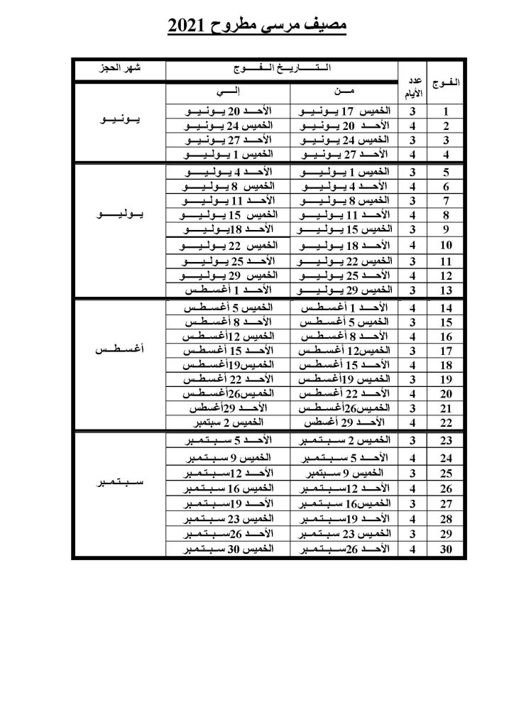 - بداية المصيف ( الفوج الأول ) يبدأ من الخميس 17/6 إلى الأحد 20/6 ، ونهاية المصيف( الفوج الأخير ) يبدأ من الأحد 26/9 و حتي الخميس 30/9 .