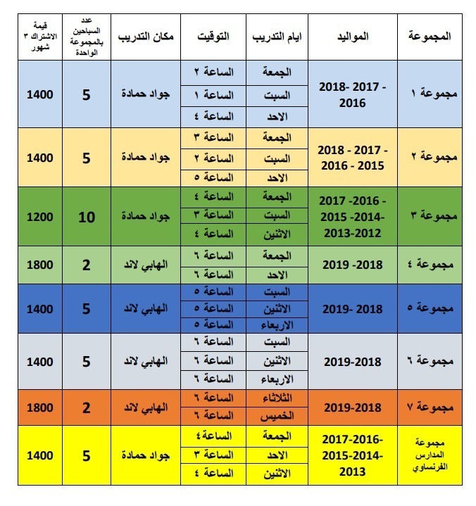 - غير مسموح نهائيا بتغيير مواعيد التدريبات أو الانتقال من مجموعة الى مجموعة و الالتزام بالحضور بالمواعيد المخصصة لكل مجموعة .