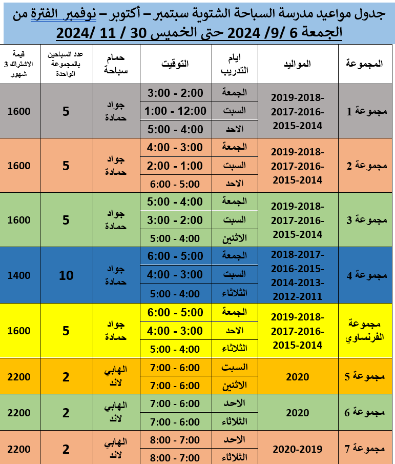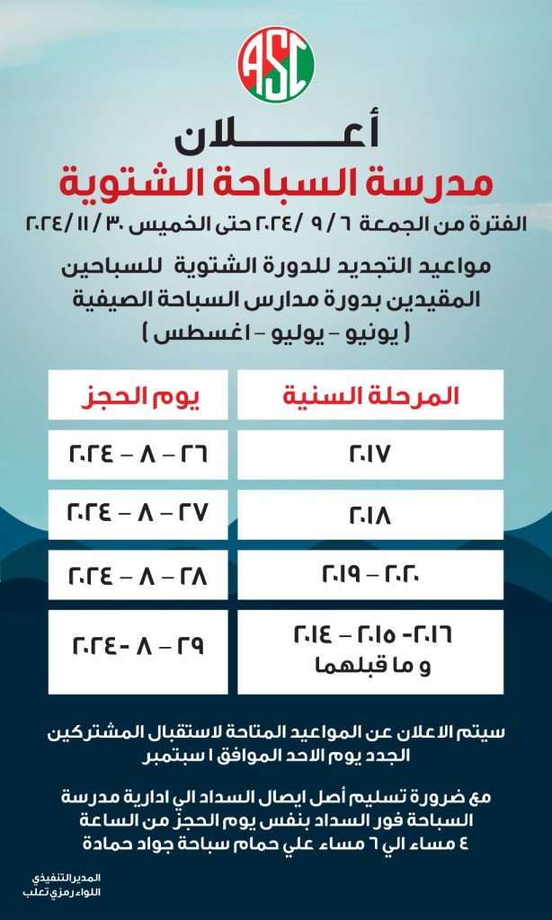يعلن مجلس إدارة النادي ولجنة السباحة عن مدرسة السباحة الشتوية وذلك للمدة من الجمعة 6 سبتمبر وحتى الخميس 30 نوفمبر 2024.