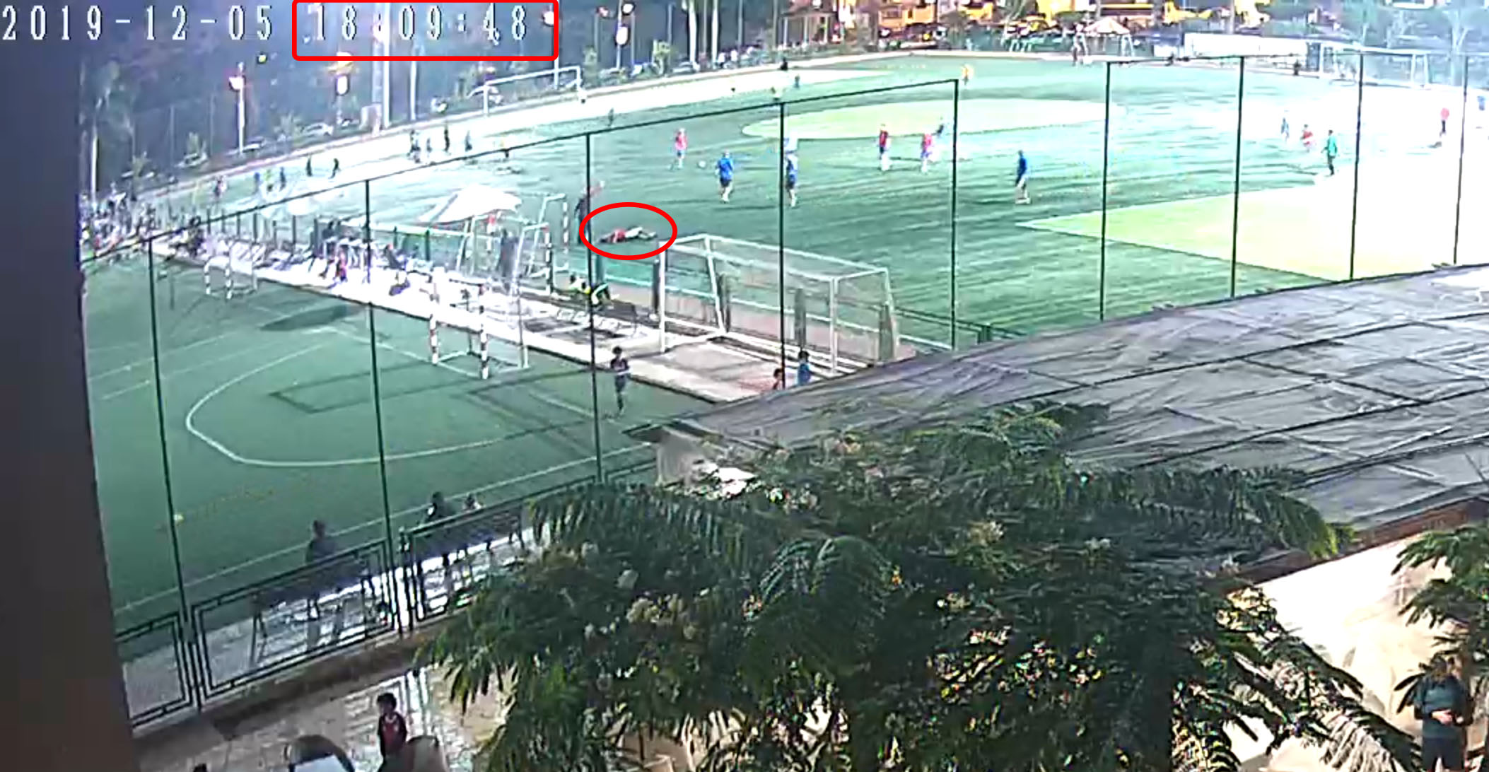 ١- الساعة ٦.١٠ وأثناء اللعب سقط المرحوم كما سجلت كاميرات النادي على الأرض وكان بعيد عن منطقة تواجد الكرة