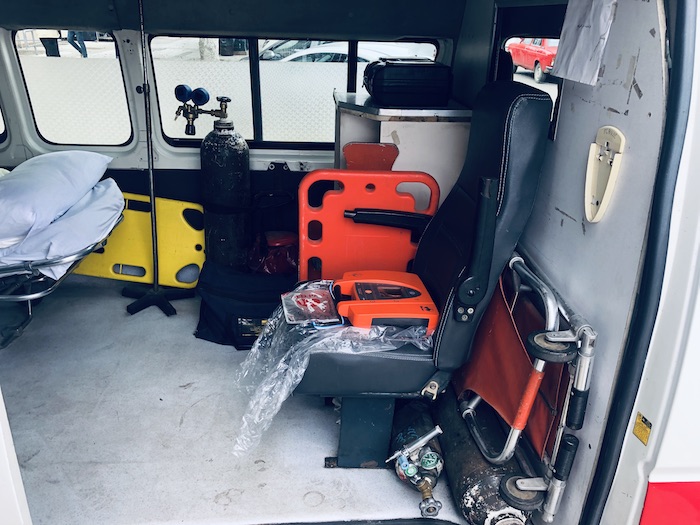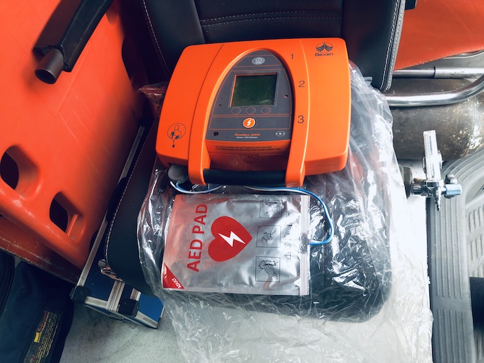 الساعة الحادية عشر م وتضم جهاز صدمات القلب كما هو موضح في الصورة وباقي أجهزة الطوارئ والإسعافات الأولية .