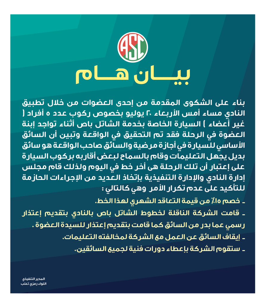 بناء على الشكوى المقدمة من إحدى عضوات من خلال تطبيق النادي مساء أمس الأربعاء ٢٠ يوليو بخصوص ركوب عدد ٥ أفراد ( غير أعضاء ) السيارة الخاصة بخدمة الشاتل باص أثناء تواجد إبنة العضوة في الرحلة فقد تم التحقيق في الواقعة وتبين أن السائق الأساسي للسيارة في أجازة مرضية والسائق صاحب الواقعة هو سائق بديل يجهل التعليمات وقام بالسماح لأقاربه بركوب السيارة على إعتبار أن تلك الرحلة هى أخر خط في اليوم ولذلك فقد قام مجلس إدارة النادي والإدارة التنفيذية بإتخاذ العديد من الإجراءات الحازمة للتأكيد على عدم تكرار الأمر وهي كالتالي :