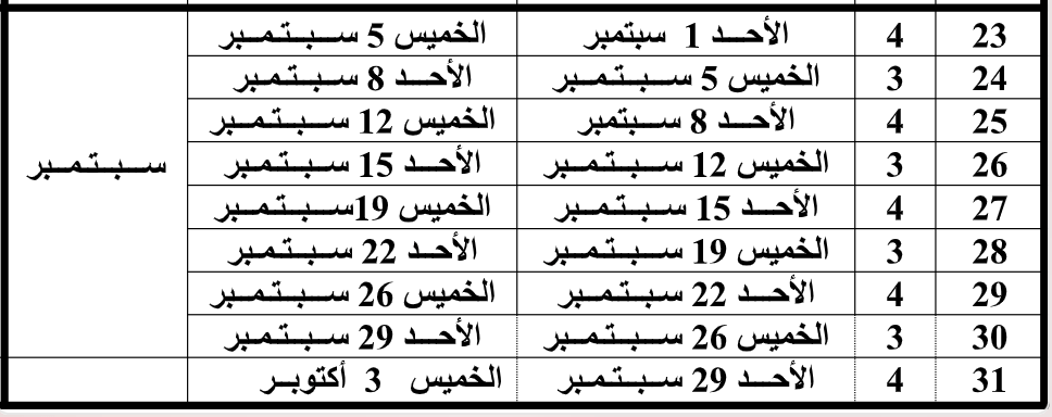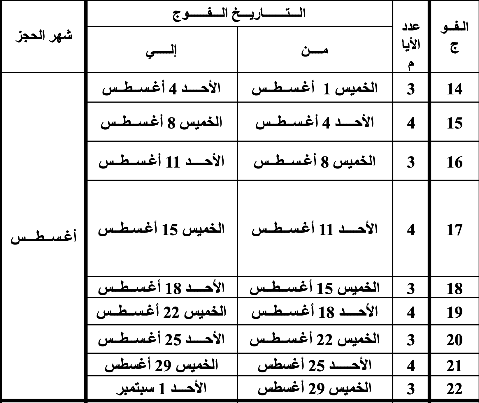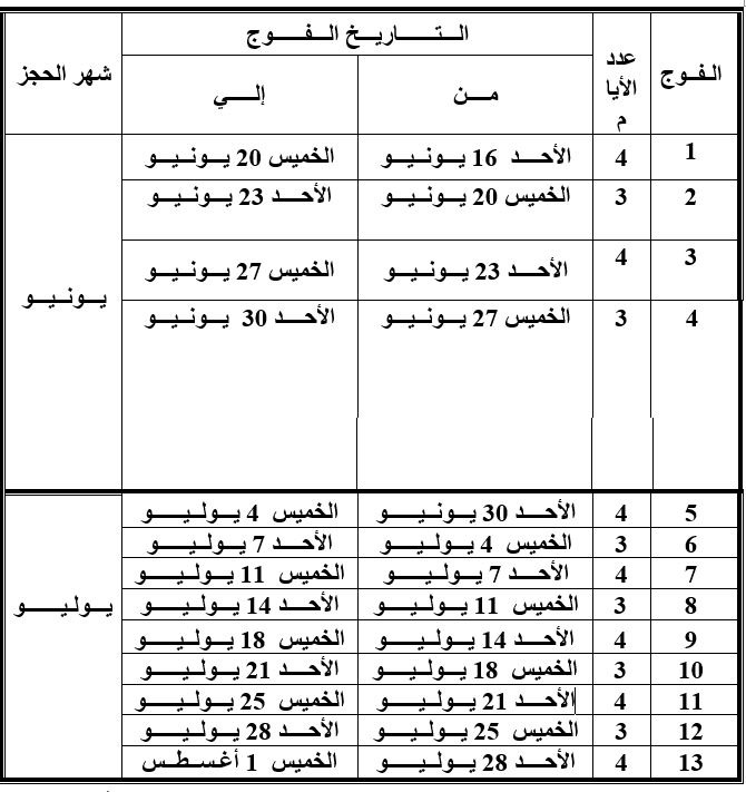 - بداية المصيف ( الفوج الأول ) يبدأ من الأحد 6/16إلى الخميس 6/20 ، ونهاية المصيف( الفوج الأخير ) يبدأ من الأحد 9/29 و حتي الخميس 10/03 .