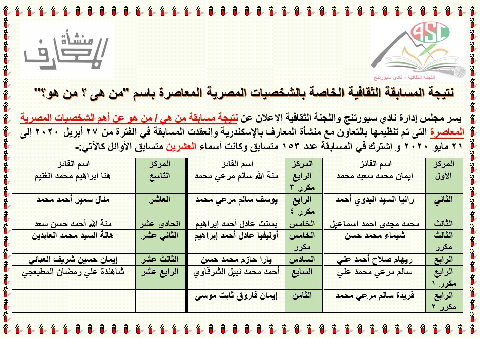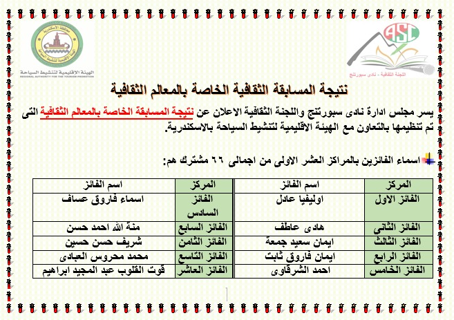 يسر مجلس إدارة النادي واللجنة الثقافية الإعلان عن نتيجة مسابقة من هي ومن هو عن أهم الشخصيات المصرية المعاصرة والتي تم تنظيمها مع منشأة المعارف بالإسكندرية والتي إنعقدت خلال الفترة من ٢٧ إبريل وحتى ٢١ مايو وإشترك بها عدد ١٥٣ متسابق وأيضا مسابقة المعالم الثقافية التي تم تنظيمها بالتعاون مع الهيئة الإقليمية لتنشيط السياحة بالإسكندرية وإشترك بها عدد ٦٦ مشترك :