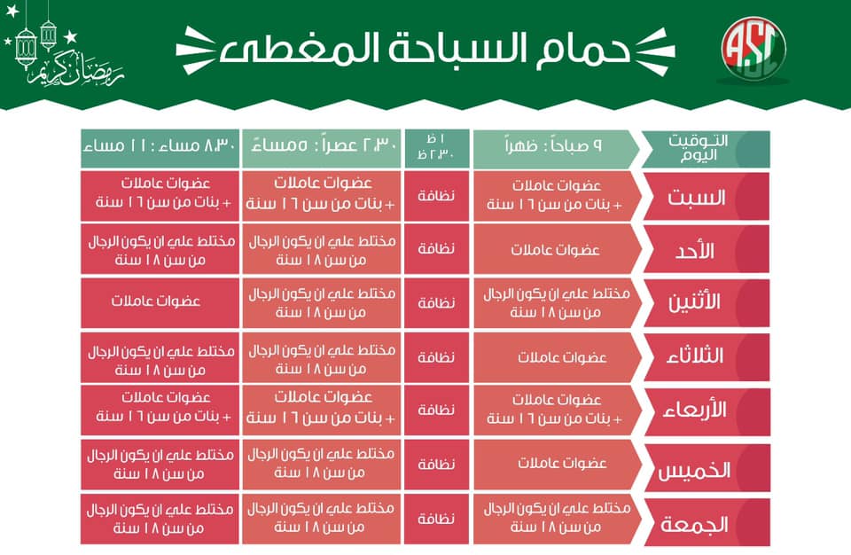 تعرف على مواعيد حمام السباحة المغطى خلال شهر رمضان الكريم