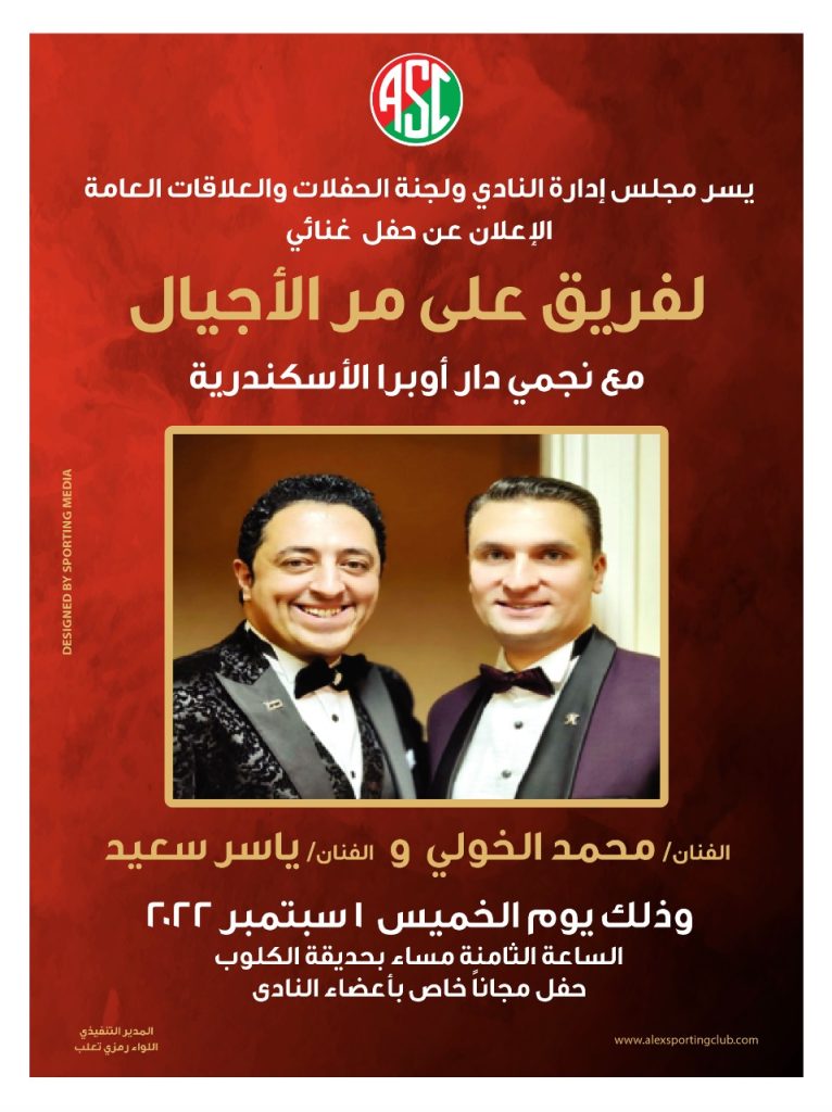 يسر مجلس إدارة النادي ولجنة الحفلات والعلاقات العامة الإعلان عن حفل غنائي لفريق على مر الأجيال مع نجمي دا أوبرا الإسكندرية الفنان محمد الخولي والفنان ياسر سعيد وذلك يوم الخميس ١ سبتمبر ٢٠٢٢ في تمام الساعة الثامنة مساء بحديقة الكلوب هاوس , ملحوظة الحفل مجاني .