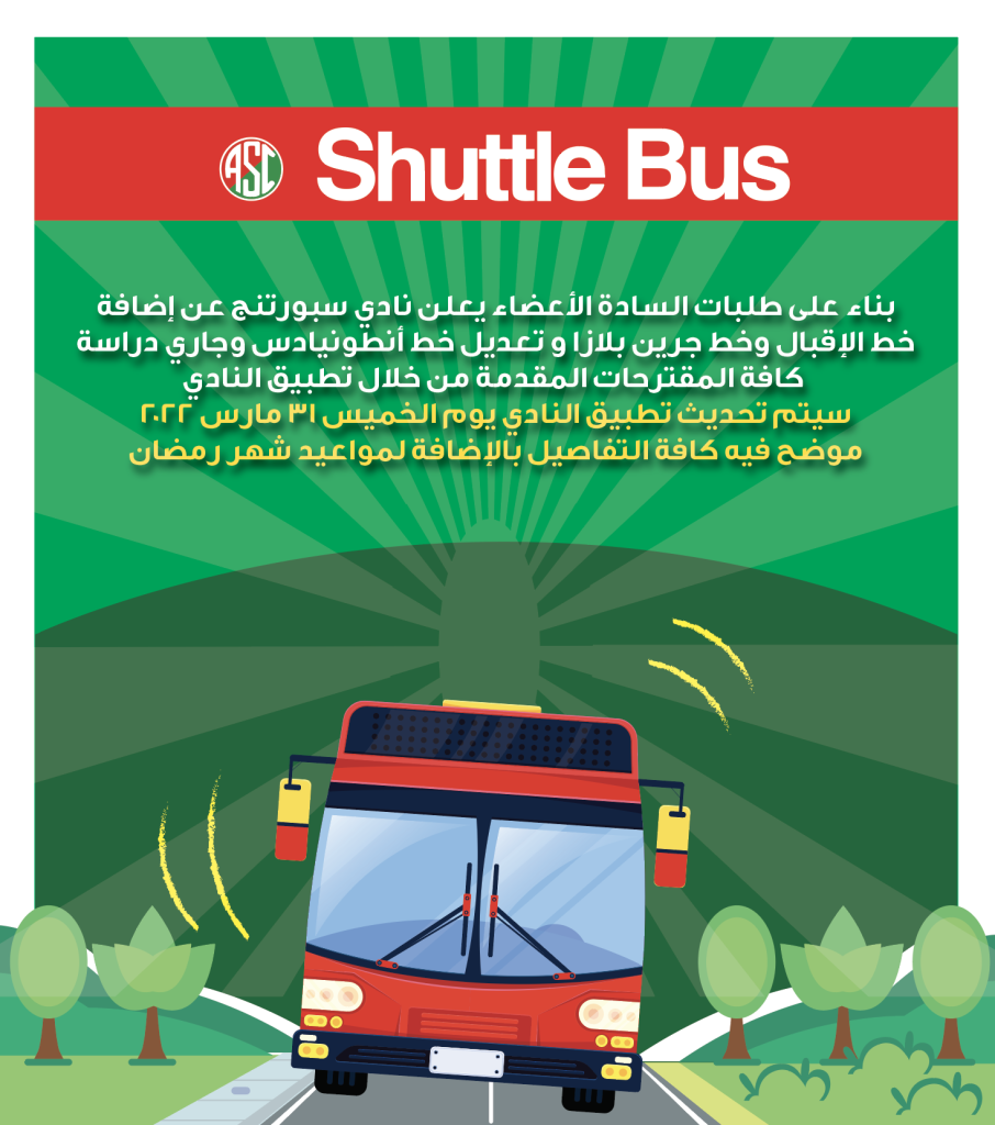 بناء على طلبات السادة الأعضاء يعلن نادي سبورتنج عن إضافة خط الإقبال وخط جرين بلازا وتعديل بعض محطات خط أنطونيادس ، و جاري دراسة كافة المقترحات المقدمة من خلال التطبيق .