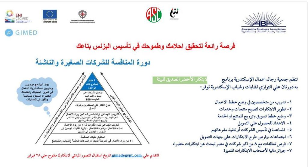 يتشرف مجلس إدارة نادي سبورتنج و لجنة الشباب الإعلان عن التعاون مع جمعية رجال أعمال إسكندرية ABA و الدعوة فى المشاركة فى GIMED Egypt Green Innovation Competitions لتشجيع أصحاب الأفكار و المشاريع الصغيرة المُحافظة على البيئة للدخول الى سوق العمل و المنافسة.