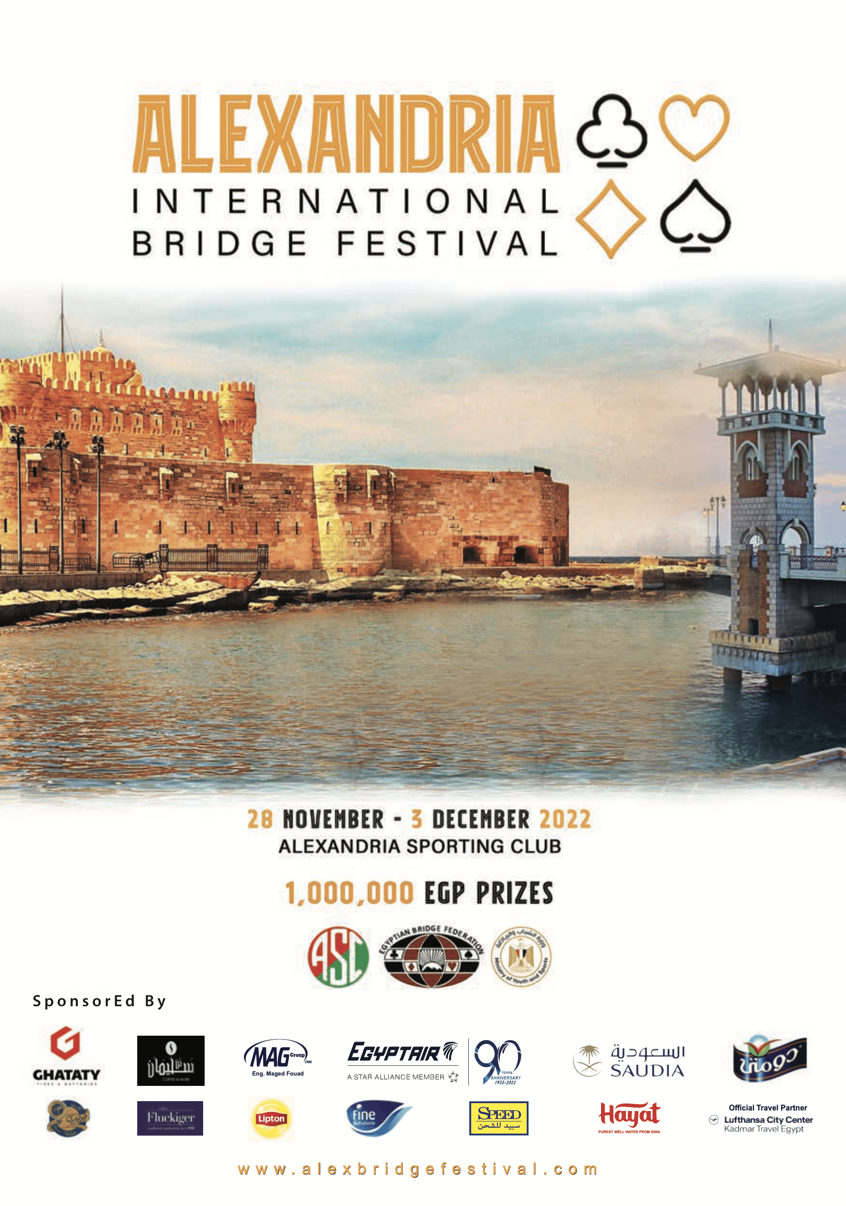 ينظم نادي سبورتنج في الفترة من ٢٨ نوفمبر إلى ٣ ديسمبر ٢٠٢٢ بطولة الإسكندرية الدولية للبريدج تحت رعاية كل من وزارة الشباب والرياضة والإتحاد المصري للبريدج وبمشاركة عدد كبير من الرعاة. يشارك في البطولة أكثر من مائتي لاعب ولاعبة من إثنتي عشرة دولة تمثل دول أوروبا وأفريقيا وآسيا وتذاع مباريات البطولة ,وتنشر نتائجها على شبكة المعلومات الدولية ويتابعها الملايين من محبي اللعبة ومشجعي مشاهير ونجوم العالم المشاركين في المهرجان. يقام في المهرجان ثلاث بطولات تتخطى جوائزها المليون جنيها مصرياِ مما وضعه في مصاف أكبر المهرجانات العالمية فضلا عن كونه من الأفضل فنياً وتنظيمياً. يبدأ المهرجان بحفل إستقبال وينتهي بحفل ساهر كبير يتم فيه توزيع الجوائز، ويحضره عدد كبير من الشخصيات الهامة وكبار المسئولين في الدولة وسفراء وقناصل الدول المشاركة ولفيف من رجال قطاع الأعمال , وقد نظم النادي مهرجان هذا العام إيمانا واقتناعا بان السياحة الرياضية هي أحد الأفرع الهامة في مجال تنمية وتنشيط وتعظيم السياحة الوافدة وانطلاقا من هذا المبدئ يقام على هامش المهرجان عددا من البرامج السياحية المتميزة التي يتم تنظيمها لجميع المشاركين والتي تعطي الصورة المشرفة والحقيقية عن مصر بصفة عامة وعن الإسكندرية بصفة خاصة.