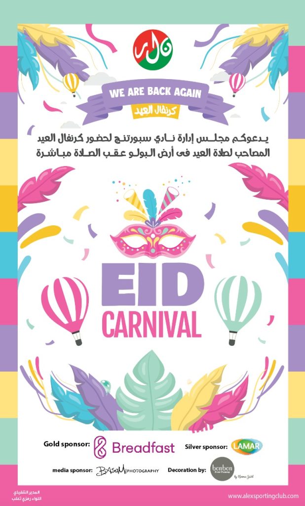 يسر مجلس إدارة النادي دعوة سيادتكم لحضور صلاة العيد بأرض البولو و يعقبها كارنڤال كبير مليء بالمفاجآت و الألعاب لجميع الأعمار