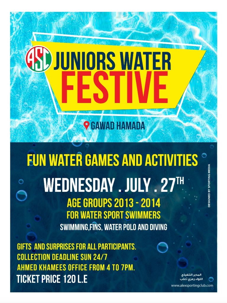 يعلن مجلس إدارة نادي سبورتنج ولجنة ألعاب الماء عن مهرجان لبراعم ألعاب الماء مواليد ٢٠١٣ و ٢٠١٤ ( سباحة – سباحة زعانف – الغطس – كرة الماء ) وذلك يوم الأربعاء ٢٧ يوليو من الساعة الثامنة صباحا وحتى الساعة الواحدة ظهرا.