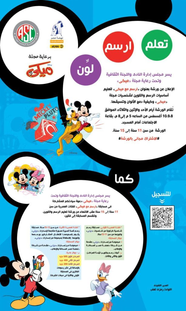 يسر مجلس الإدارة و اللجنة الثقافية الإعلان عن تنظيم ورشة لتعلم رسم الشخصيات الكرتونية برعاية مجلة “ميكي” يعقبها مسابقة لرسم الشخصيات الكرتونية و مسابقة أخرى لرسم قصة قصيرة مصورة مشابهة لاصدارات “ديزني”.