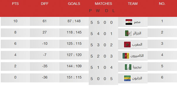 ليحقق المنتخب المصرى العلامة الكاملة و الفوز فى جميع مباريات المجموعة و احتلال صدارة الترتيب برصيد 10 نقاط من الفوز فى خمس مباريات