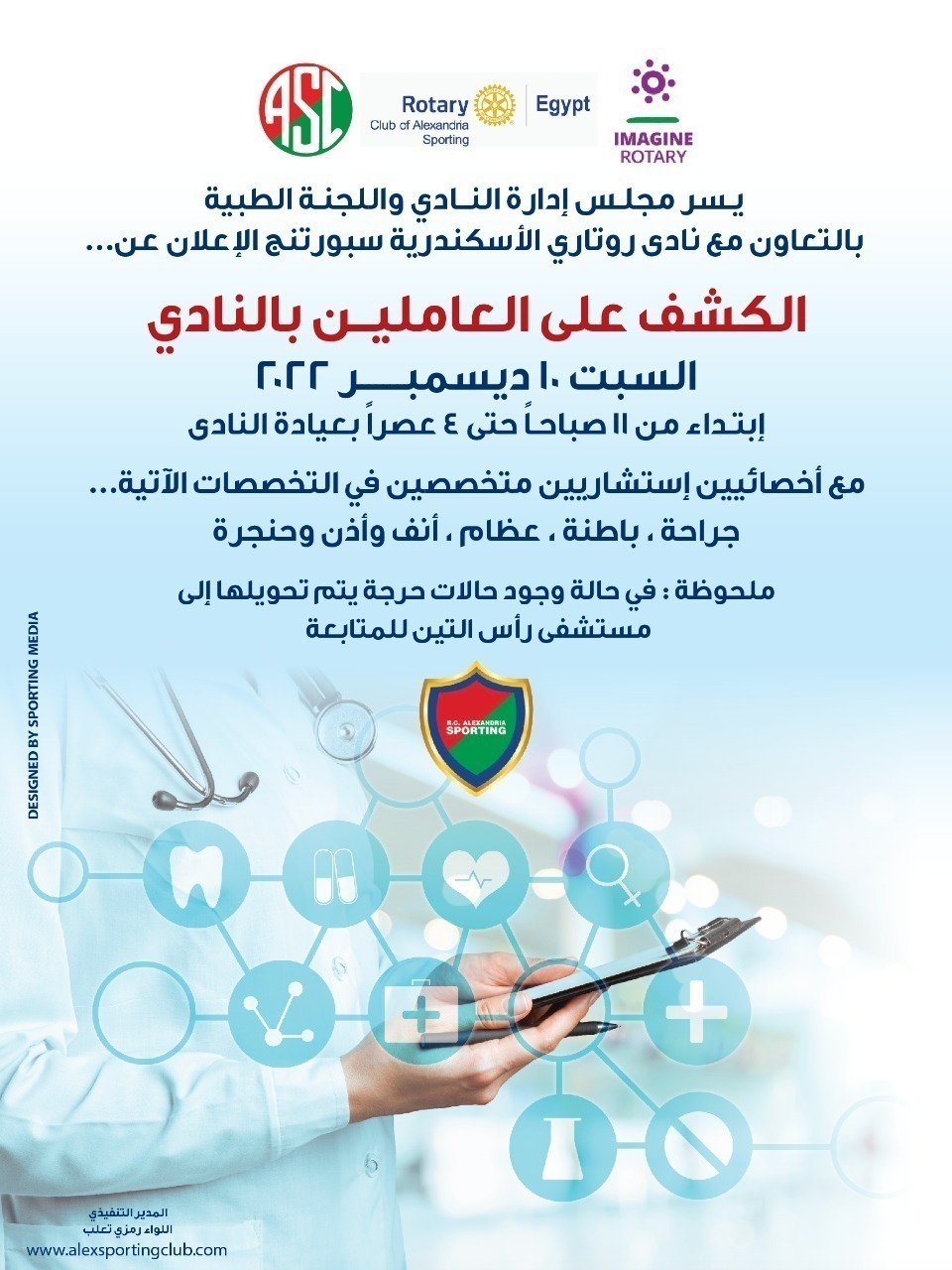 يسر مجلس إدارة النادي واللجنة الطبية بالتعاون مع نادي روتاري الإسكندرية سبورتنج الإعلان عن الكشف على العاملين بالنادي وذلك يوم السبت ١٠ ديسمبر إبتداء من ١١ صباحا حتى ٤ عصرا عيادة النادي مع إخصائيين إستشاريين متخصصين في التخصصات الآتية ” جراحة – بطانة – عظام – أنف وأذن وحنجرة ” ملحوظة في حالة وجود حالات حرجة يتم تحويلها إلى مستشفي رأٍس التين للمتابعة