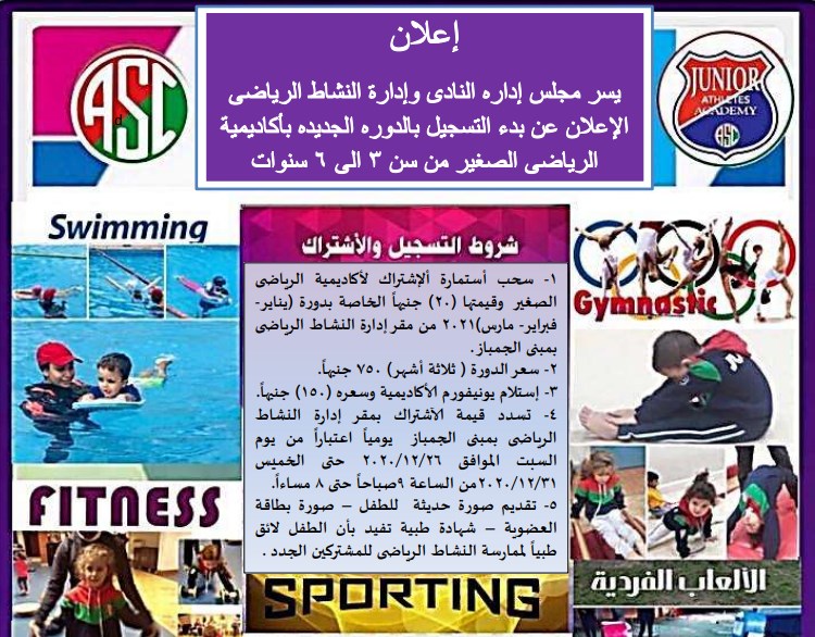 بدء التسجيل بالدورة الجديده بأكاديمية الرياضى الصغير
