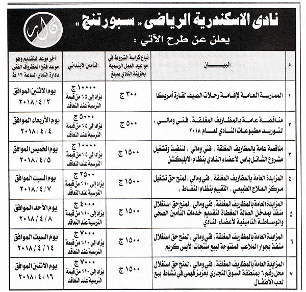 مزايدات و مناقصات نادي سبورتنج بجريدة الأهرام