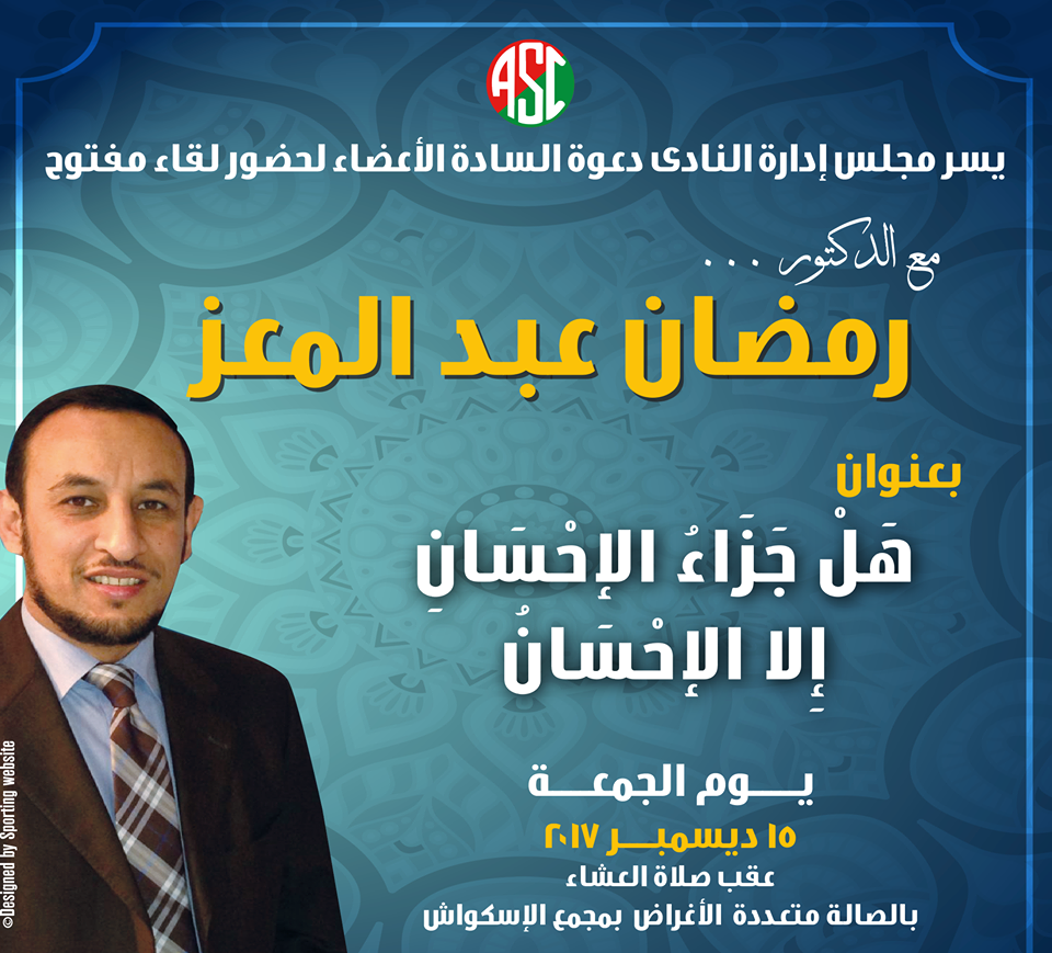 ندوة للشيخ رمضان عبد المعز بعنوان ” هل جزاء الإحسان إلا الإحسان ” الجمعة 15 ديسمبر