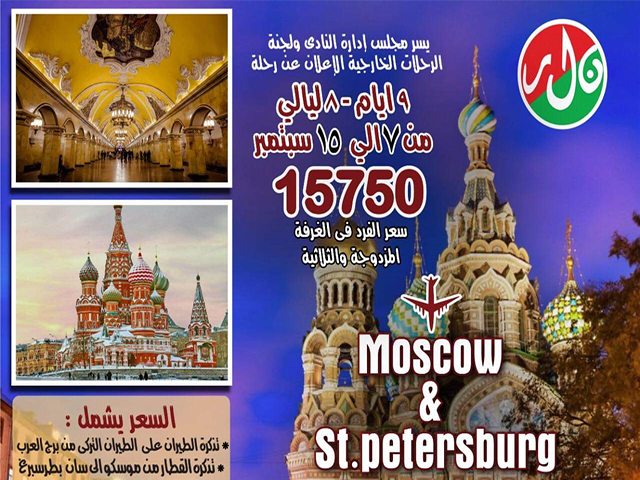 رحلة إلى موسكو و سان بيترسبرج لمدة 9 أيام بتاريخ 7 سبتمبر