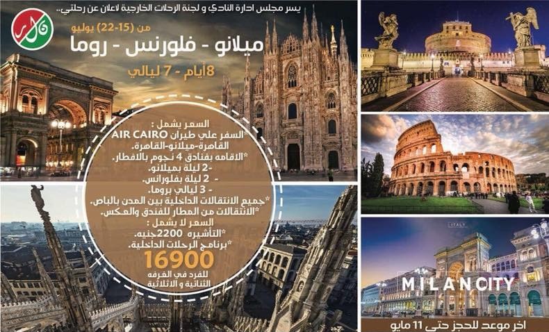 رحلة 8 أيام إلى ” ميلانو – فلورنس – روما ” بتاريخ 15 يوليو