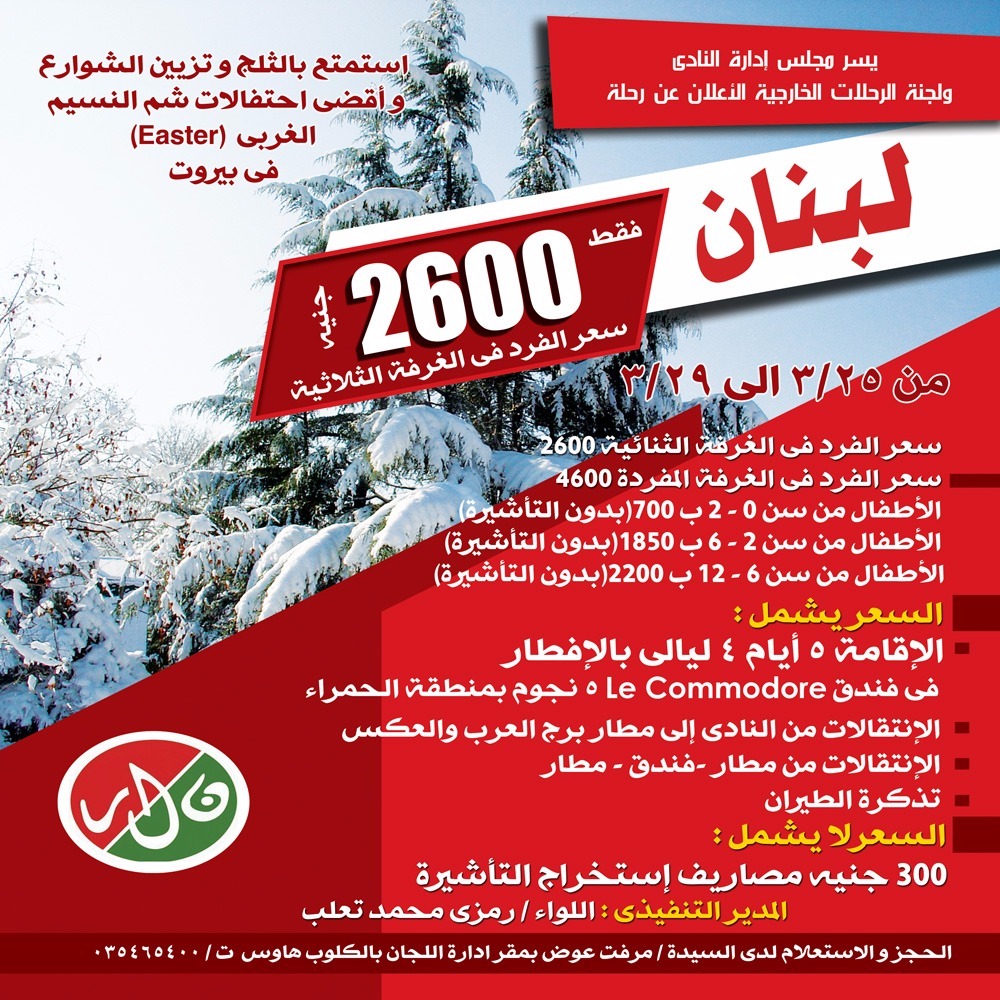 يسر مجلس إدارة النادي ولجنة الرحلات الخارجية الأعلان عن رحلة لبنان في الفترة