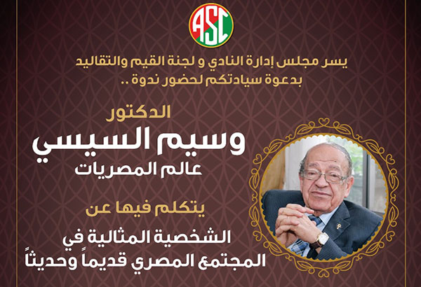 ندوة للدكتور وسيم السيسي عالم المصريات بنادي سبورتنج يعقبه عشاء راقي