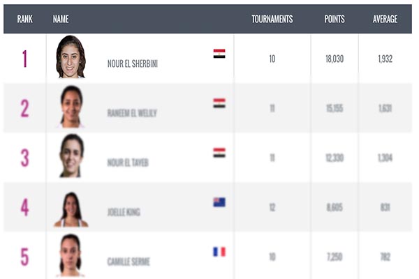 نور الشربيني تستمر في صدارة التصنيف العالمي للشهر ال٢٩