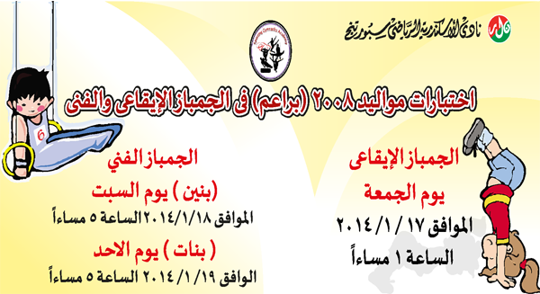 تنطلق يوم الجمعة القادمة 17 يناير إختبارات الجمباز الإيقاعي و الجمباز الفني مواليد 2008 بنين