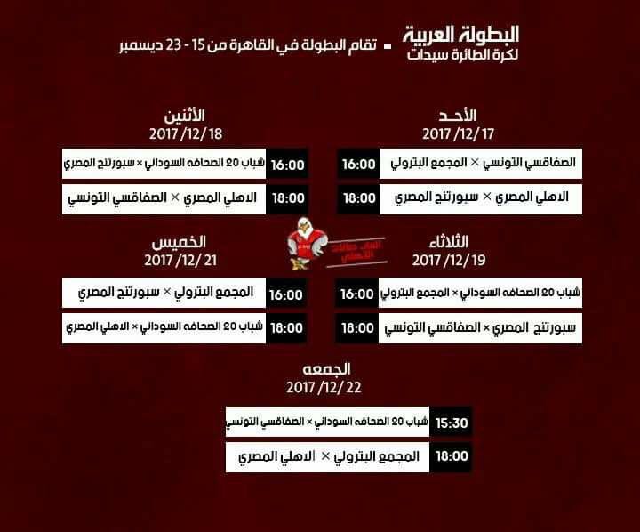 قرعة البطولة العربية للكرة الطائرة .. سبورتنج يواجة الاهلي في افتتاح البطولة