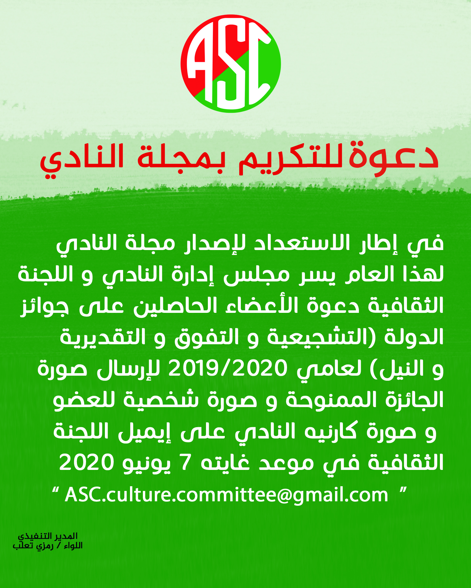 في إطار الاستعداد لإصدار مجلة النادي لهذا العام يسر مجلس ادارة النادي و اللجنة الثقافية دعوة الأعضاء الحاصلين على جوائز الدولة (التشجيعية و التفوق و التقديرية و النيل) لعامي ٢٠١٩/٢٠٢٠ لإرسال صورة الجائزة الممنوحة و صورة شخصية للعضو و صورة كارنيه النادي على ايميل اللجنة الثقافية في موعد غايته 7 يونيو ٢٠٢٠.