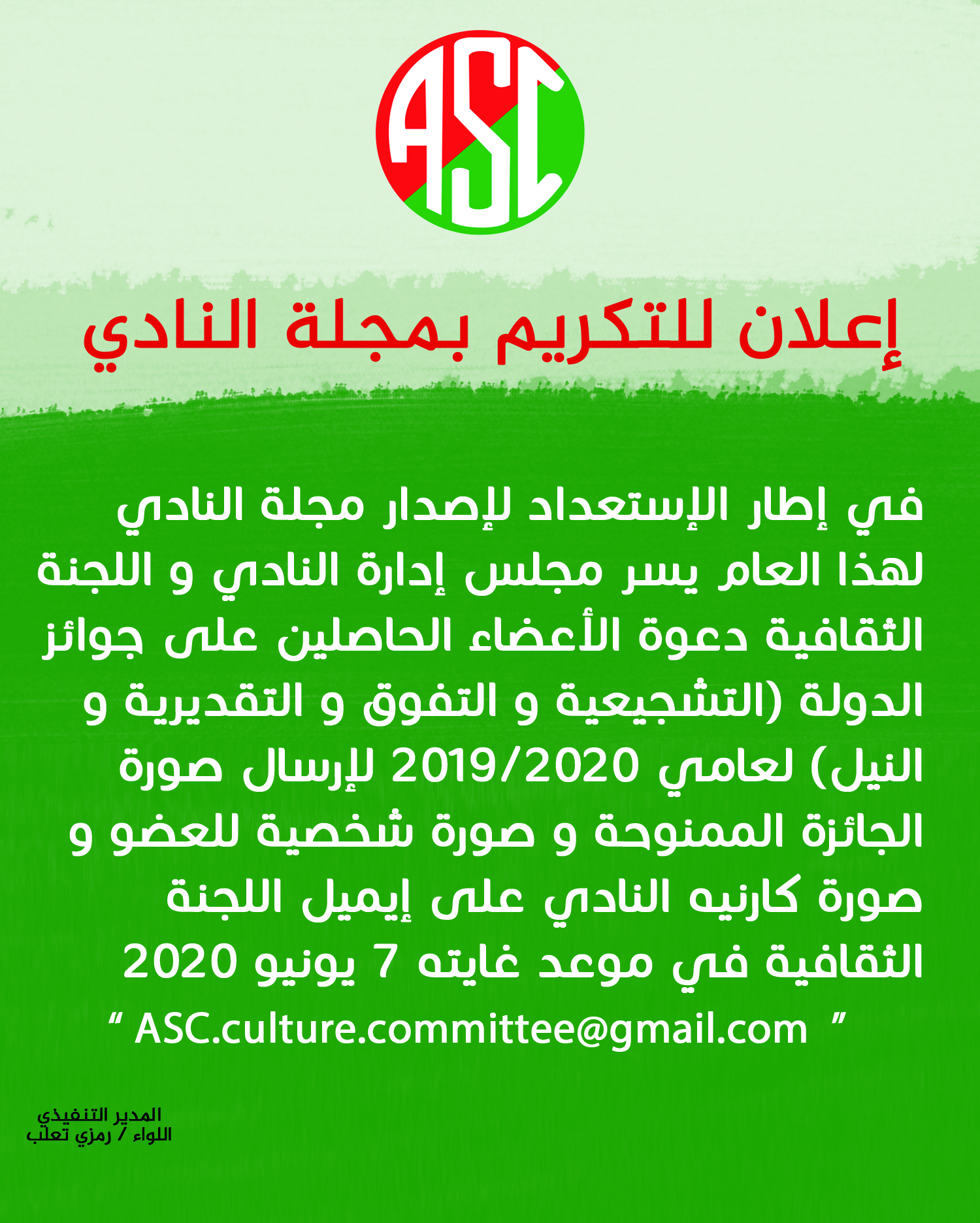 في إطار الاستعداد لإصدار مجلة النادي لهذا العام يسر مجلس ادارة النادي و اللجنة الثقافية دعوة الأعضاء الحاصلين على جوائز الدولة (التشجيعية و التفوق و التقديرية و النيل) لعامي ٢٠١٩/٢٠٢٠ لإرسال صورة الجائزة الممنوحة و صورة شخصية للعضو و صورة كارنيه النادي على ايميل اللجنة الثقافية في موعد غايته 7 يونيو ٢٠٢٠.
